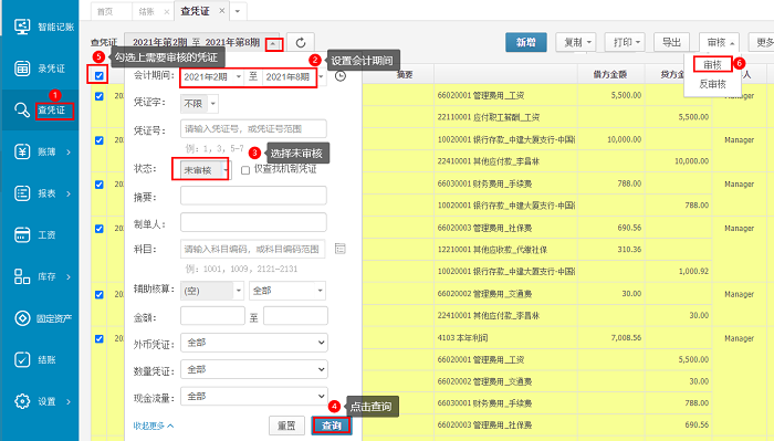【操作流程】进入账簿后,点击【查凭证】-【状态】选择【未审核】-设置需要查询的会计期间,点击查询,查询后勾选上未审核的凭证点击【审核】