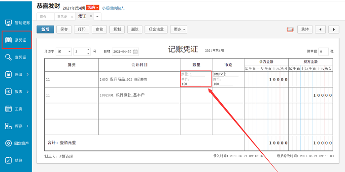 在凭证中录入数量和单价,需要给相关科目勾选数量核算