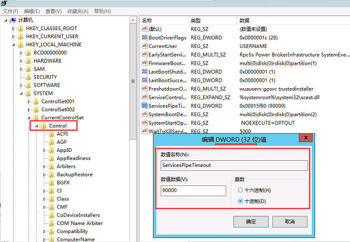 2、进入注册表,展开到HKEY_LOCAL_MACHINE-SYSTEM-CurrentControlSet-Control注册表,选中“control”后,在右侧空白处新增一个DWORD,名称为“ServicesPipeTimeout”,然后右键选择【修改】,选择十进制,值为90000或120000,保存后,重启计算机;