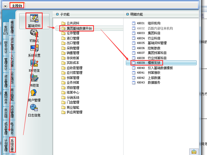 1、登录合并账务的账套,依次打开【系统设置】→【基础资料】→【集团基础数据平台】,双击打开【模板发放】;