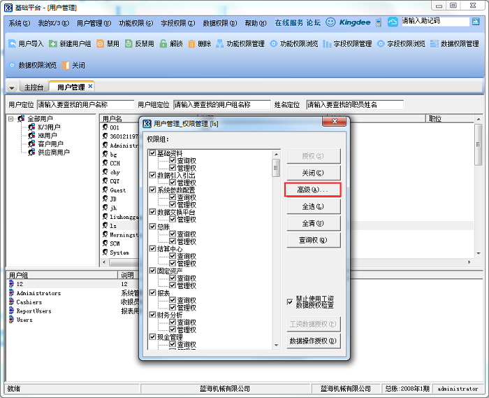 2、依次单击【系统设置】→【用户管理】→【用户管理】,双击打开【用户管理】,选中对应的操作员,单击右键分别查看功能权限管理和数据权限管理中是否授予用户科目查看权限。