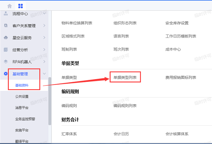 1、使用有权限的用户登录金蝶云星空客户端,依次点击【基础管理】-【基础资料】,打开【单据类型列表】;