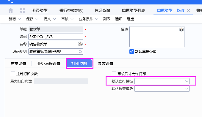 2、左侧依次展开【出纳管理】-【收款单】,选择收款单后点击对应的单据类型进入,反审核后修改点击【打印控制】页签,取消默认套打模板,设置完毕后重新提交审核,其他相关的单据类型设置类似。