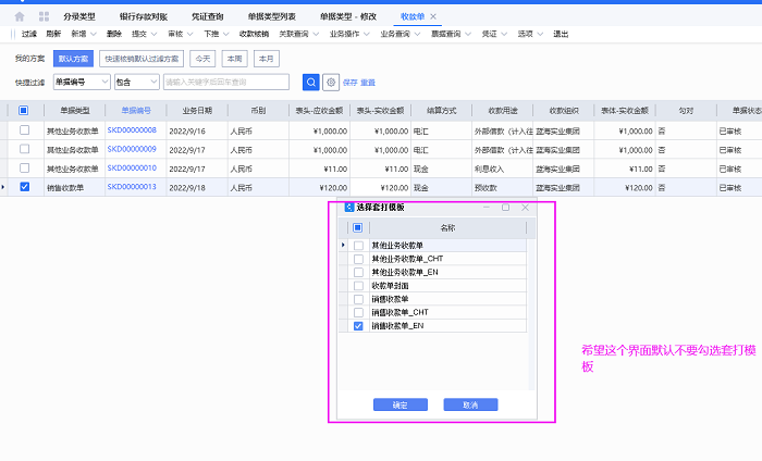 设置完之后重新打开收款单列表,点击打印或者预览时弹出选择打印模版的界面默认已经没有勾选套打模板。