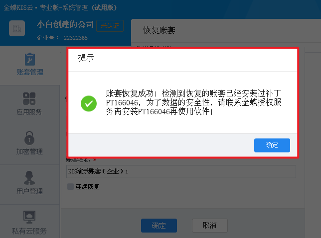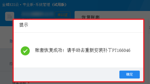 如果该账套的补丁版本比当前环境的补丁版本更新,系统会提示“账套恢复成功!检测到恢复的账套已经安装过补丁...,为了数据的安全性,请联系金蝶授权服务商安装...再使用软件!”。请按照提示在恢复账套的环境安装该账套对应的补丁。