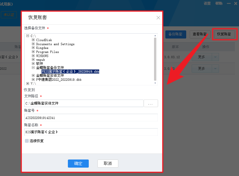 如果需要同时恢复多个账套,可以勾选恢复账套界面的【连续恢复】选项。则在当前账套恢复完毕后,系统仍然会保留在恢复账套的界面,用户可以继续选择其他需要恢复的账套。