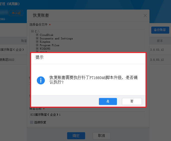 如果当前环境的补丁版本比该账套的补丁版本更新,系统会提示“恢复账套需要执行补丁...脚本升级,是否确认执行?”,请点击【是】执行该脚本,确保账套补丁与当前环境补丁一致。
