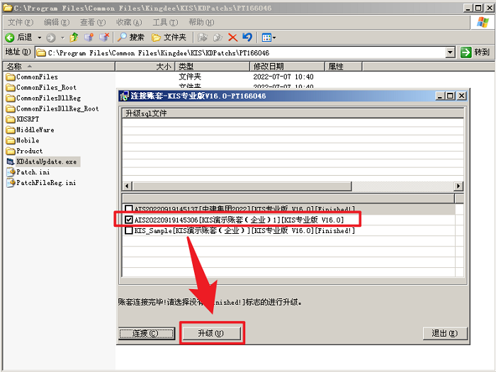 如果不小心选择了【否】,则该账套会继续恢复成功,同时提示“账套恢复成功!请手动去重新安装补丁...”。此时请在对应补丁安装路径下找到KDdataUpdate.exe后双击运行,系统会自动勾选未执行脚本的账套(没有finish标志的),点击【升级】将该账套升级。