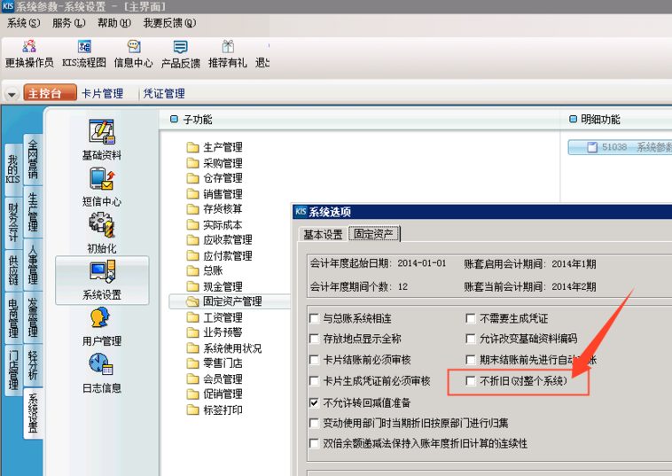 3、单击【固定资产】页签,取消选择【不折旧(对整个系统)】。