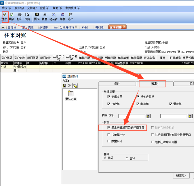 2、打开【过滤条件】窗口,单击【高级】页签,选中其他下面的复选框【显示产品或劳务的详细信息】,单击【确定】即可。