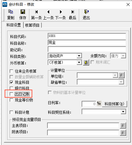 3、在基础平台-科目中双击打开科目,取消勾选【科目设置】页签中的【出日记账】即可。