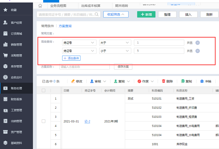 在查询条件中选择【方案查询】,设置高级查询凭证号大于1并且 凭证号小于5点击【查询】即可。
