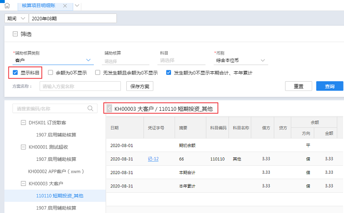处理:如果在查询核算项目明细账时,需要按科目余额方向显示,请在查询时勾选参数【显示科目】,并在左边列表定位对应的科目查询数据。