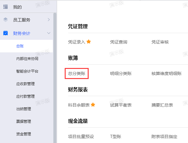 1、使用有权限的用户登录金蝶云星空,依次单击【财务会计】-【总账】-【账簿】-【总分类账】功能;