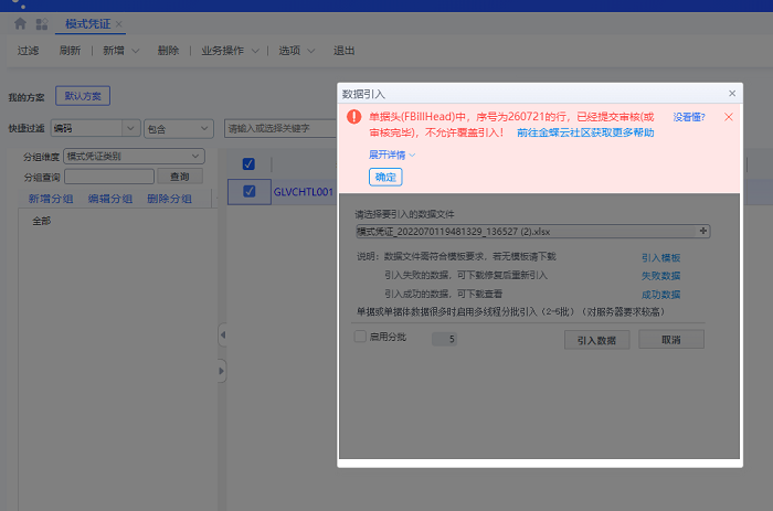 金蝶云星空模式凭证覆盖引入提示:已经提交审核或审核完毕不允许覆盖导入?