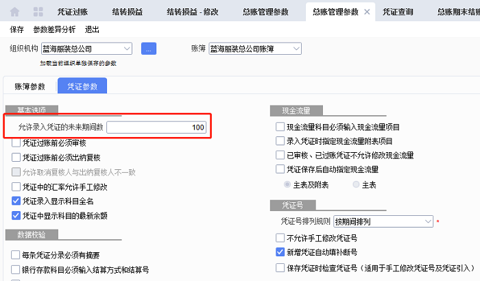 依次打开[财务会计]→[总账]→[参数设置]→[总账管理参数]→[凭证参数],可以看到允许录入未来期间数参数,将此处维护成需要的录入的未来期间数(最大值不能超过100),维护好之后保存参数设置即可正常录入未来期间凭证