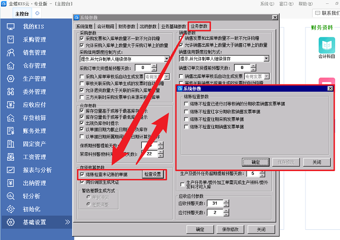 1、结账检查未记账单据,支持对部分业务场景单据选择不进行检查