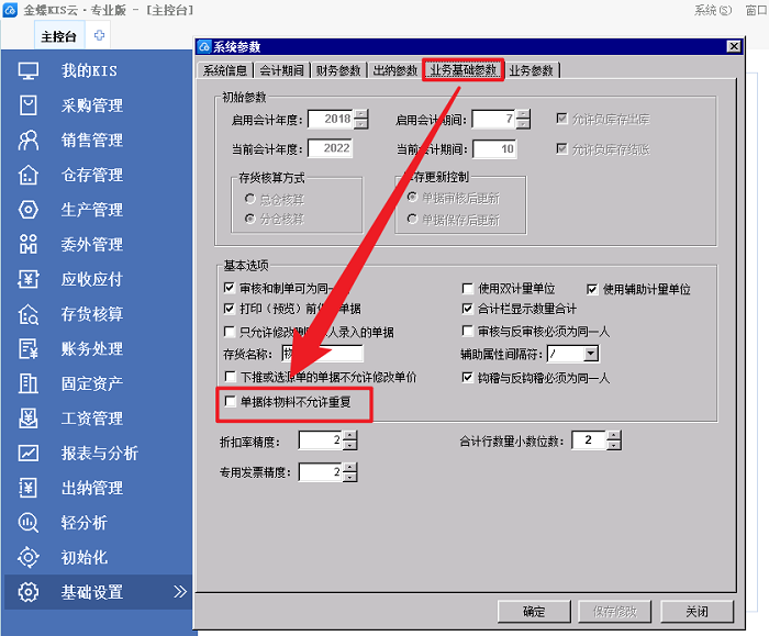 2、新增业务基础参数:单据体物料不允许重复,保存时进行检验