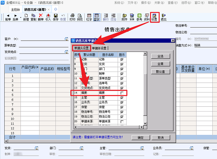 问题2:销售出库单的单据表头不显示【摘要】字段