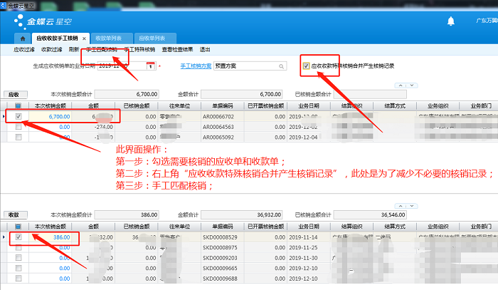 第二步:右上角“应收收款特殊核销合并产生核销记录”,此处是为了减少不必要的核销记录;