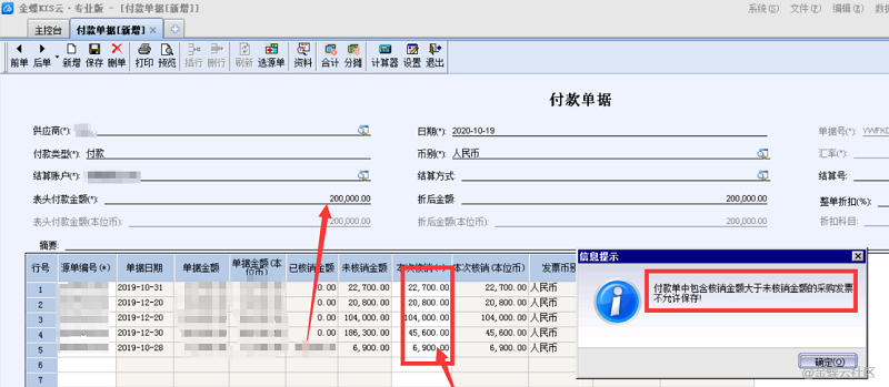 专业版付款单选择源单采购发票保存时提示:付款单中包含核销金额大于未核销金额的采购发票,不允许保存!