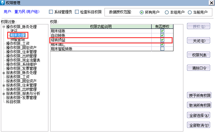 4、在权限对象处单击选中[操作权限_账务处理]-[期末处理],然后单击选中右边的[有否授权]处,授予结转损益权限,最后单击[授权]即可。