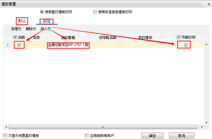 2、登录k/3Cloud,进入【总账】→【凭证查询】,点击菜单栏【选项】→【套打设置】,在【默认】页签下选择上一步设置的套打模板,并且在【高级】页签下再选择上一步设置的模板,勾选【启用】和【节纸打印】,点击【确定】;(如图-2)