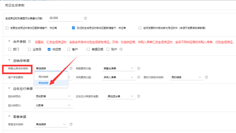 【账务处理】-【生成凭证】-【参数设置】-【销售出库成本结转】选择单独结转