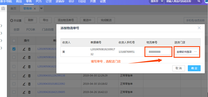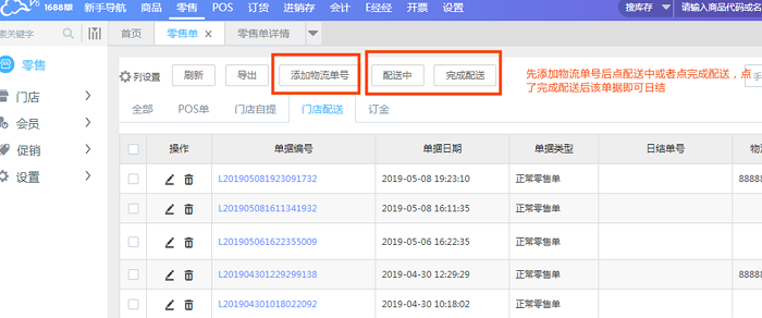 2、门店配送(目前仅微信订货小程序支持门店配送)门店配送目前需要已支付(配微信支付)的单据才可以,如果未支付,点配送时会提示不支持微信小程序下单之后选择不同的配送方式之后,在网页端零售单的界面可以查询到,门店配送界面可以添加物流及单号信息。