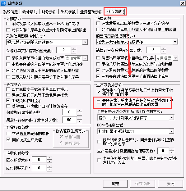 单击[基础设置]-[系统参数]-[业务参数]将“关联销售订单生成生成任务单及委外加工单时,扣减其已关联销售出库的数量”。