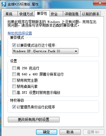 选择金蝶KIS标准版图标,单击右键[属性]-[兼容性]设置以兼容模式运行此程序以及以管理员身份运行此程序即可。