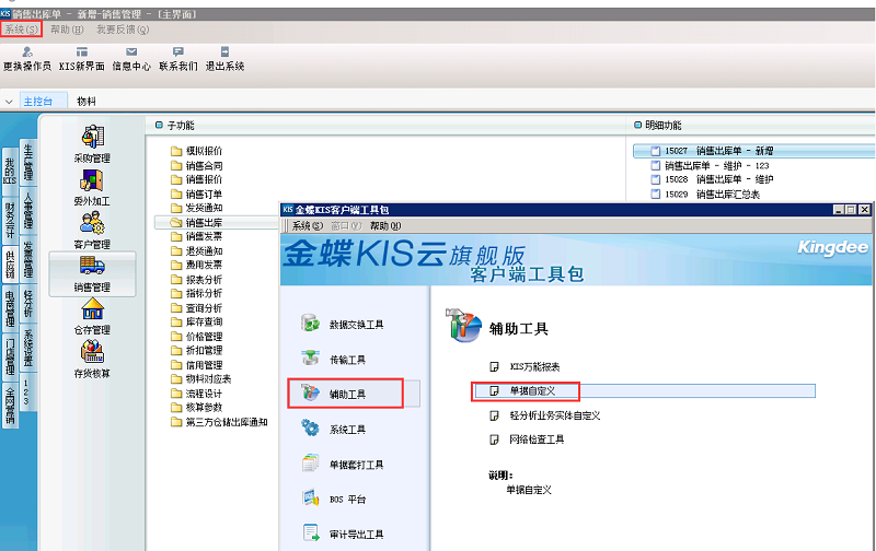 1、软件主界面点击左上角【系统】,左键单击【客户端工具包】,进入到【金蝶KIS客户端工具包】锦棉,选择到辅助工具—单据自定义,鼠标左键【打开】,跳出账套登录界面后,选择对应账套输入用户名和密码做登录;