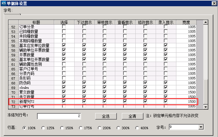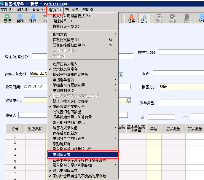 3、如果是单据体的自定义字段,需要在新增单据界面,点击【选项】,打开【单据体设置】,在【单据体设置】窗口看对应自定义字段是否勾选显示。
