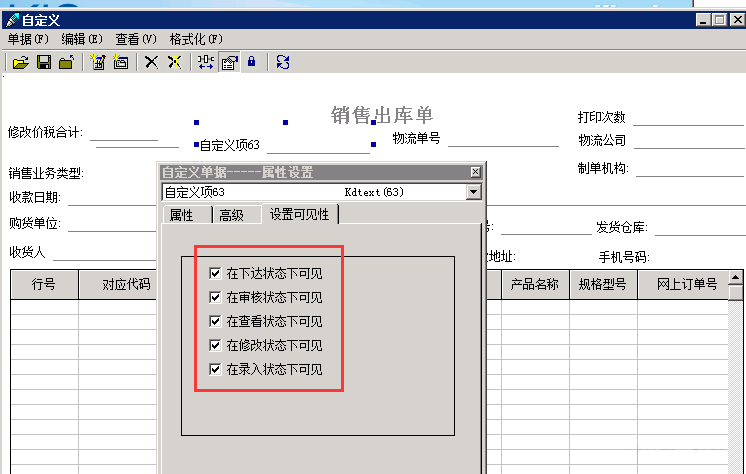 2、打开单据自定义的销售出库单,进入自定义界面,找到对应的自定义字段,单击鼠标右键,点击【属性】,在【自定义单据-----属性设置】页签门店及到【设置可见性】页签,查看可见性是否勾选;