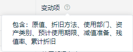 固定资产变动项纪录包含:原值、折旧方法、使用部门、资产类别、预计使用期限、减值准备、残值率、累计折旧