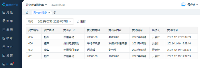筛选需要查询的会计期间,固定资产变动纪录表显示筛选期间内资产的相关变动