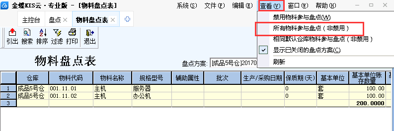 2、单击[查看],单击勾选[所有物料参与盘点(非禁用)]。