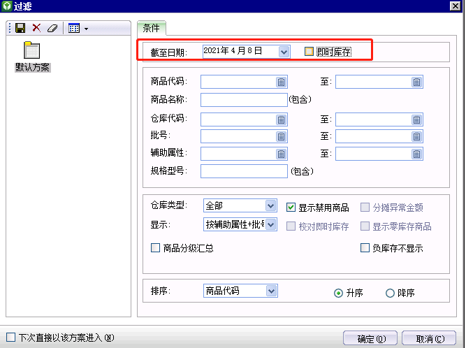 查看即时库存时过滤条件上取消参数“即时库存”按照[截止日期]查询。