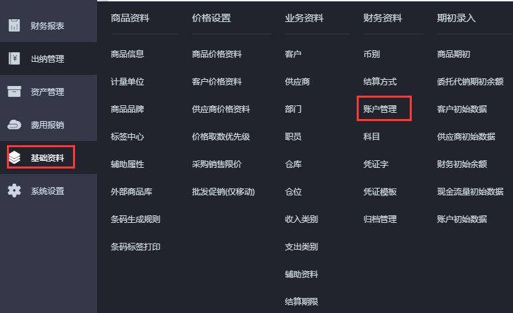 1、[基础资料]-财务资料[账户管理],新增微信、支付宝等其他银行账户