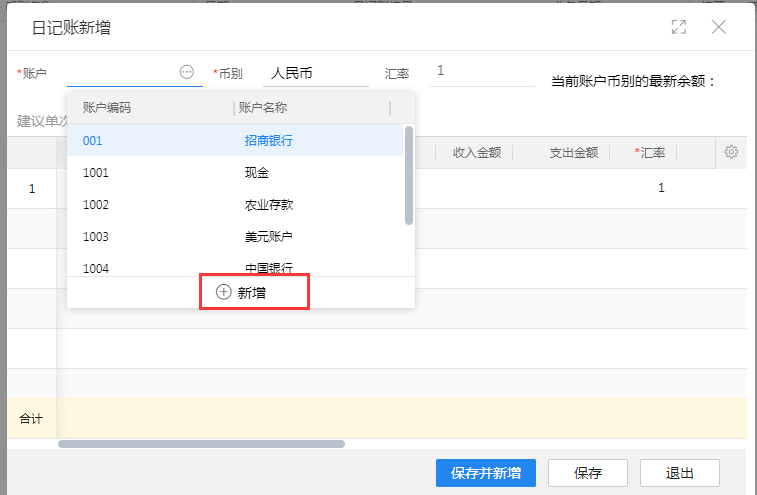 2、支持在登记日记账界面,在选择账户下拉框界面点击新增