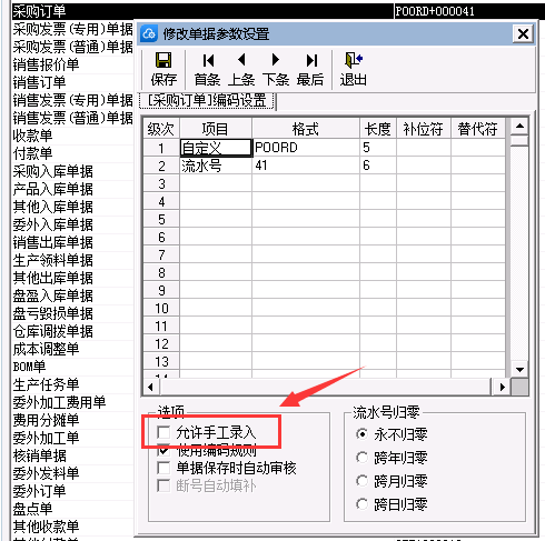 3、弹出[修改单据参数设置]窗口,在[选项]页签中单击勾选[允许手工录入],单击[保存]即可。