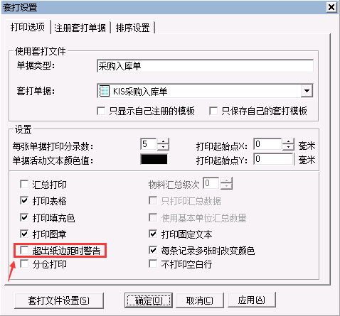 由于在[采购入库单]-[文件]-[套打设置]中,选中了[超出纸边距时警告],当纸张偏小或页边距偏大时,打印预览采购入库单时会有此提示,建议取消勾选[超出纸边距时警告],然后再调整纸张。