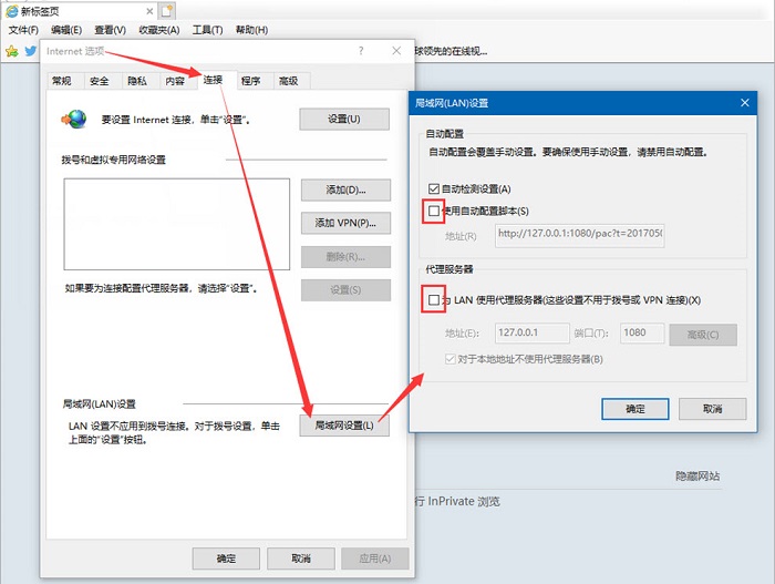 4、 IE工具\Internet选项\连接\局域网设置(下面2个复选框不勾选)