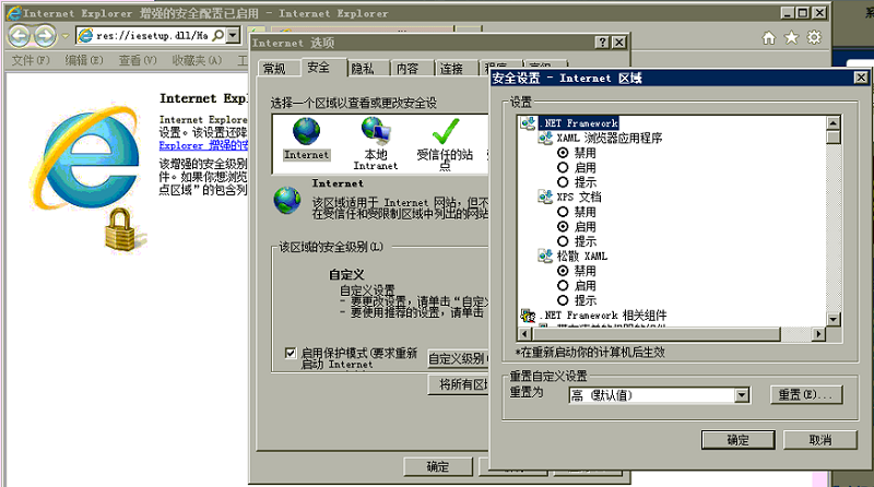 7、 IE选项-安全设置异常,找一台能正常连接使用的电脑,将IE选项-安全-Internet-自定义级别里面的设置和正常电脑一样设置,或者重置一下IE(IE选项-高级-重置)