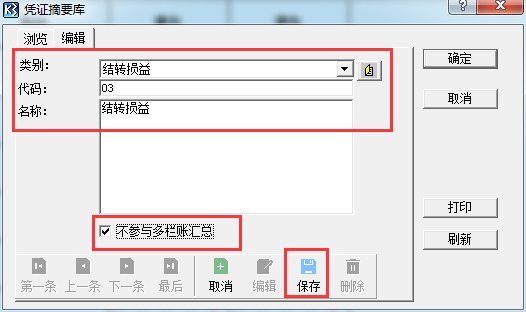 需要手工录入结转损益凭证,且在新增结转损益凭证时,摘要需要新增摘要库,按F7 去选择摘要,且新增的摘要库需要勾选参数[不参与多栏账汇总],注意结转损益的凭证每条分录都需要按F7 去选择摘要库,显示如下图: