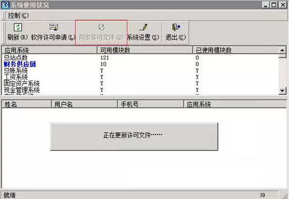 2、登录账套管理后,依次单击 [系统]→[系统使用状况]→[同步许可文件]。