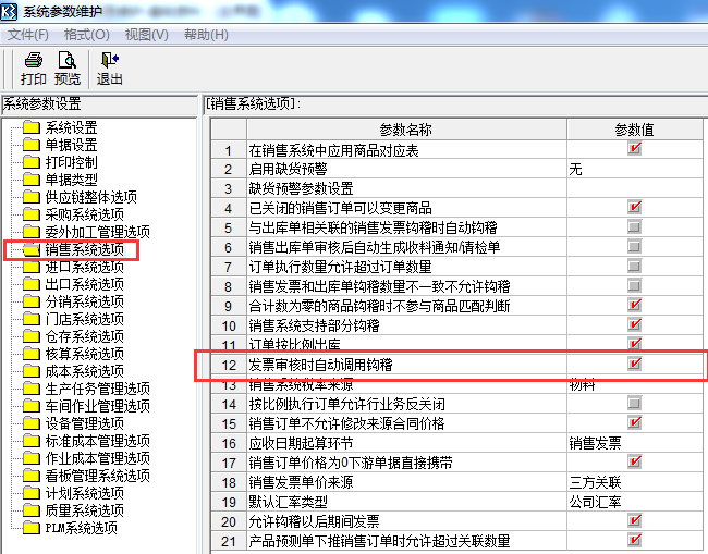 登陆K3主控台,依次单击[系统设置]—[系统设置]—[销售管理],双击系统设置进入系统参数维护界面,选择销售系统选项,勾选参数:发票审核时自动调用勾稽。