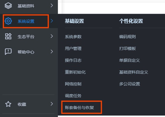 (1)登录后进入需要备份的子账套A,在系统设置—账套备份与恢复界面进行开始备份操作,并等待备份完成暂不支持下载备份!】