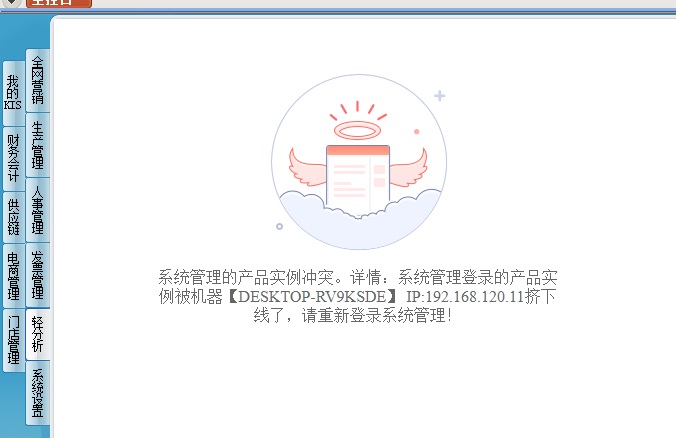 进入KIS专业版轻分析模块提示:系统管理的产品实例冲突。详情:系统管理登录的产品实例被机器【XXXXXX】IP:XXX挤下线了,请重新登录系统管理!如何处理?