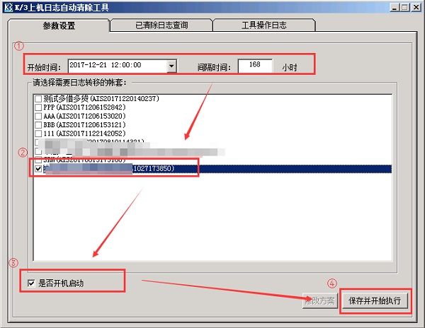 3、下载“K/3上机日志自动清除工具”,解压后同理运行,弹出K/3登录界面登录,后,在“参数设置”页签中,设置“开始时间”和“间隔时间”,然后勾选需清理定期清理上机日志的账套,并建议勾选“是否开机启动”,最后单击“保存并开始执行”即可实现定时自动清理上机日志。